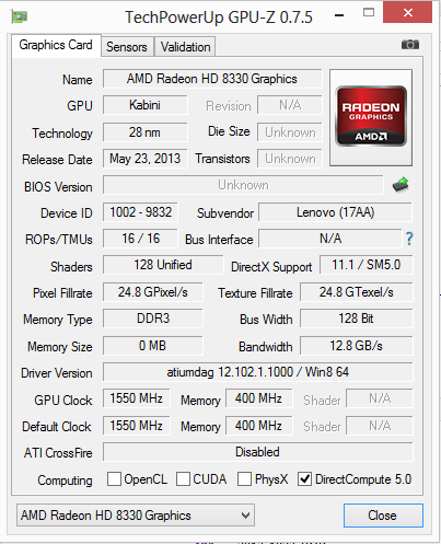 Auch der Grafikkern des Ideapad stammt von AMD. Dieser trägt die Bezeichnung Radeon HD 8330. Die GPU unterstützt DirectX 11.1 und arbeitet mit einer Geschwindigkeit von 500 MHz. Einen Turbo gibt es nicht. In allen 3D Mark Benchmarks schneidet das Ideapad deutlich besser ab als das Satellite (Celeron N2810, HD Graphics (Bay Trail)) und das Aspire (Celeron 1017U, HD Graphics (Ivy Bridge)). Das überrascht nicht, denn das S215 ist mit dem stärksten Grafikkern bestückt. Leistungsmäßig ist er in etwa auf dem Niveau des HD Graphics 4000 Kerns von Intel einzuordnen.