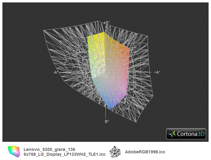 Hochwertige Panels bieten oft auch eine gute bis sehr gute Farbraumabdeckung. Diese wollen wir hier nur der Vollständigkeit wegen benennen, den Sie ist nur für Profi-Bildbearbeiter interessant. Wie erwartet ist das S300 von der Referenz Adobe RGB 1998 weit entfernt, gleiches gilt für sRGB. Deshalb fällt auch der Vergleich mit dem High-End-Panel des Asus UX31A negativ aus.