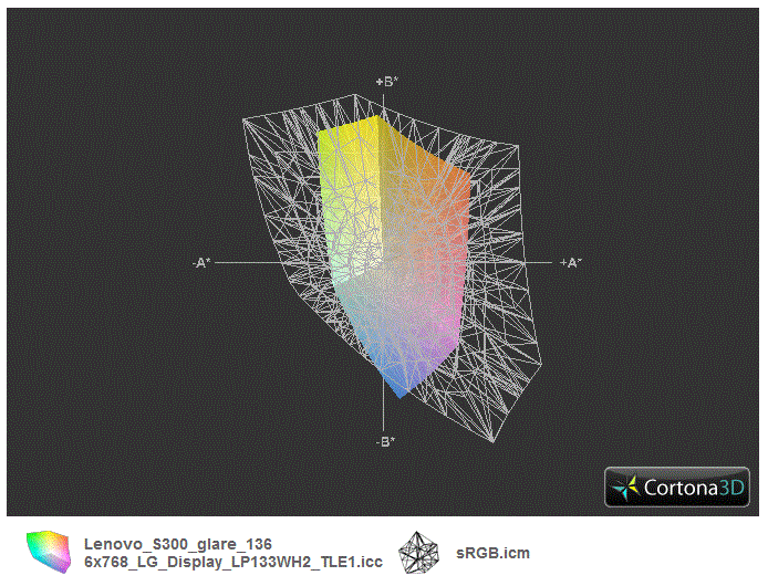Lenovo verbaut ein HD-Panel mit der nativen Auflösung von 1.366 x 768 Pixeln. Die 16:9-Anzeige (LG Display LP133WH2-TLE1) wurde nicht entspiegelt. Der Kontrast von 168:1 fällt gering aus. Der Glare-Type macht diesen Nachteil optisch aber wieder etwas wett. Für die Preisklasse des S300 sind blasse Farben an der Tagesordnung, Alternativen gibt es erst ab 1.000 Euro aufwärts (Asus UX31A).