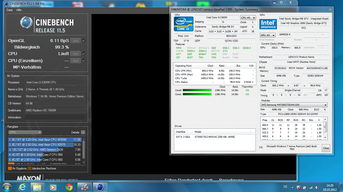 Der R11.5 CPU Multi 64 Bit Test (1,34 Punkte) fällt 78 % schlechter aus als mit dem i5 3317U (Aspire V5-571 & HP Envy 6). Gegenüber dem Low-Voltage-Celeron 887 (-15%) kann er sich aber durchsetzen. Der technisch idente i3 2367M (Asus UX32A) liegt gleichauf. Die AMD-APU A6-4455M (-37 %) rechnet etwas langsamer. Gleiche Tendenzen ermitteln die Cinebench-R10-Tests.