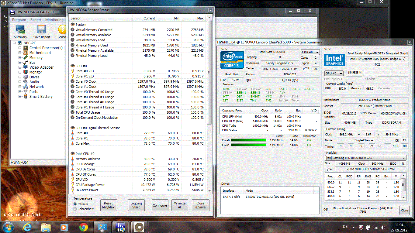 Den mehrstündigen Stresstest für CPU und HD 7450M hielt das S300 souverän durch. HWinfo vermeldet in diesem Sinne stets den Standard-Takt von 1,4 GHz. Die mit Vorsicht zu genießende CPU-Temperatur-Angabe von HWinfo zeigt maximal 80 Grad am Prozessor an.