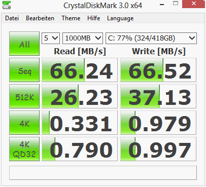 Im Gegensatz zu den Ultrabooks verzichtet Lenovo bei S400 und S405 auf einen SSD-Cache zur Beschleunigung der langsamen rotierenden Festplatte. Auf einen rasanten Kaltstart muss der Nutzer daher verzichten. Dennoch dauert ein Windows-8-Start nur zirka 25 Sekunden (Desktop-Eingaben sind möglich, es wird weiter geladen). Die Western Digital Scorpio Blue (WD5000LPVT, 500GB) hat im HDD-Vergleich schlechte Read-Werte. 66 MB/s im CrystalDiskMark sind unterdurchschnittlich. Ein SSD könnte den HDD Sub-Score des PCMark 7 spielend von 1.438 auf 4.000 bis 5.000 Punkte drücken. Dies würde das S405 jedoch unverhältnismäßig verteuern und für die preissensible Kundschaft uninteressant machen.
