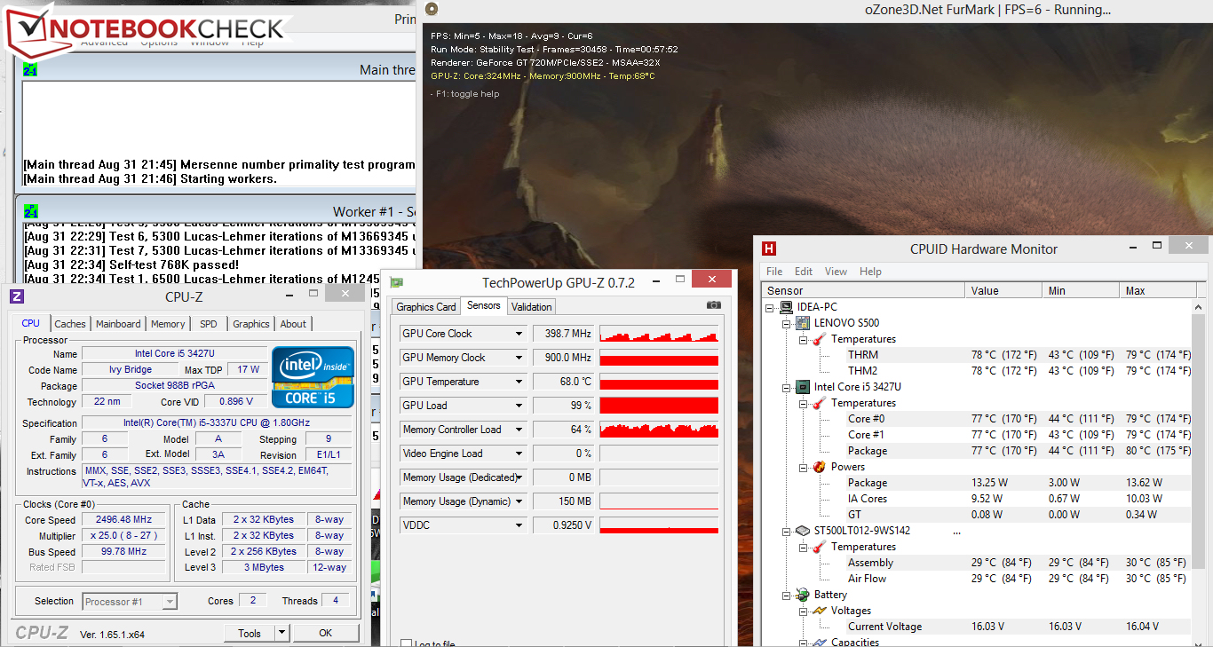 Den Stresstest (Prime95 und Furmark laufen für mindestens eine Stunde) durchläuft die CPU im Netzbetrieb mit 2,4 GHz, im Akkubetrieb mit 1,8 GHz. Die GPU arbeitet im Netzbetrieb nicht mit konstanter Geschwindigkeit. In der ersten Minute kann der GPU-Turbo voll genutzt werden. Dann schwanken die Geschwindigkeiten permanent mit Tendenz nach unten. Nach etwa 10 Minuten hat sich dann ein Verhalten eingespielt, das für den Rest der Laufzeit beibehalten wird. Sobald die GPU eine Temperatur von 70 Grad Celsius erreicht hat, sinkt ihre Geschwindigkeit auf 325 MHz. Gleichzeitig sinkt ihre Temperatur auf etwa 68 Grad Celsius. Anschließend wird die Geschwindigkeit stufenweise wieder erhöht. Dabei werden etwa 625 bis 663 MHz erreicht und die Temperatur steigt gleichzeitig wieder auf 70 Grad Celsius.
