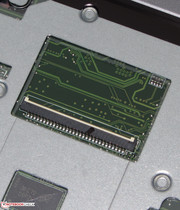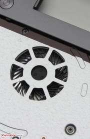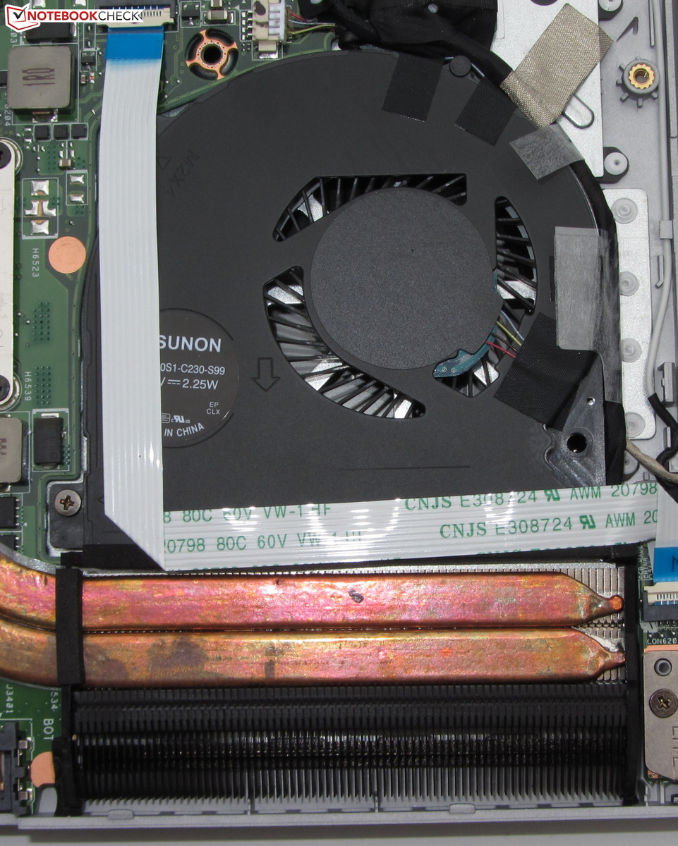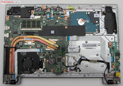 Nach Entfernung der Unterschale ist der Zugriff auf den Arbeitsspeicher, die Festplatte, das WLAN-Modul, die BIOS-Batterie, den SSD-Cache und den Lüfter möglich. Letzterer könnte zwecks Reinigung entfernt werden. Das Ideapad ist mit einer Arbeitsspeicherbank ausgestattet, die mit einem 8-GB-Modul belegt ist. Ein Tausch der Festplatte wäre möglich. Es passen aber nur 2,5-Zoll-Festplatten mit einer Bauhöhe von 7 mm in den Rechner.