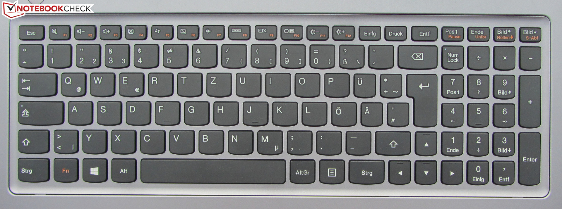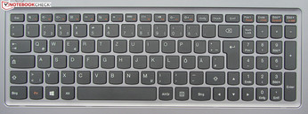 Das Ideapad ist mit einer unbeleuchteten Chiclet-Tastatur ausgestattet. Die Haupttasten besitzen eine Auflagefläche von etwa 15 x 15 mm. Die flachen, glatten Tasten verfügen über einen kurzen Hub und einen klaren Druckpunkt. Auch der Tastenwiderstand geht in Ordnung. Während des Tippens wippt die Tastatur leicht - im Zentrum etwas stärker als an den Rändern. Als wirklich störend hat sich das Wippen aber nicht erwiesen. Das typische Lenovo Kennzeichen weist auch die Tastatur des S500 auf: Die Enter-, Backspace- und die rechte Shifttaste fallen etwas schmal aus. Alles in allem handelt es sich hier um eine solide Tastatur für den Hausgebrauch. Mit den guten Tastaturen vergleichbarer Thinkpad Notebooks von Lenovo, beispielsweise dem Thinkpad S440 Touch, kann sie nicht mithalten.