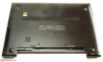 Das komplette Gehäuse des S500 ist aus Kunststoff gefertigt. Das eint das Gerät mit dem Sleekbook. Asus hingegen setzt beim Vivobook auch Aluminiumelemente ein. Das Ideapad nimmt die keilförmige Bauweise seiner Geschwister der S-Serie auf. Zwei Farben kommen zum Einsatz: Die Oberseite der Base Unit und die Umrandung des Bildschirms sind in einem matten Anthrazit gehalten. Bei der Unterschale sowie der Deckelrückseite hat Lenovo sich für ein mattes Schwarz entschieden. Zusätzlich sind diese beiden Elemente mit einer Textur versehen, die an gebürstetes Aluminium erinnert. Leider zeigen sich diese beiden Bauteile sehr anfällig für Fingerabdrücke.