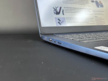 Bis auf den Kensington Port auf der rechten Seite, findet man alle Schnittstellen auf der linken Seite - praktisch für Rechtshänder. Der USB-C Port wird auch für das Netzteil genutzt, wodurch man eventuell auf eine Dockingstation angewiesen ist, um ihn zu nutzen. So wie der weitere USB-A Port unterstützt das Chromebook jedoch nur USB 3.2 Gen 1 (früher USB 3.0 und damit 5 Gbps = 400 MB/s). Mit dem Headset-Port und der Micro-SD Schnittstelle vermisst man aber eigentlich nur einen HDMI-Port. Da der MediaTek-Chip die Video-Ausgabe mit Full HD begrenzt, ist der Einsatz eines externen Monitors auch diesbezüglich eingeschränkt.