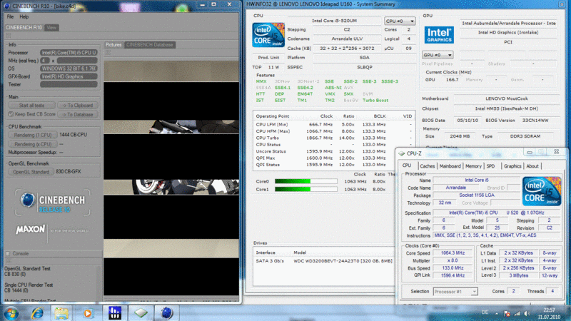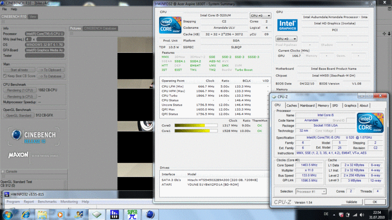 Woran liegt die für einen i5-520UM ungewöhnlich niedrige Performance? Alle Prozessor- wie Systembenchmarks leiden unter der langsamen Rechengeschwindigkeit. Wir prüfen mit dem Single Core Benchmark SuperPi sowie dem Cinebench R10 und stellen fest: Das Turbo Boost des U160 taktet stark ungleichmäßig und nicht so hoch wie Turbo Boost im 1830T. Während der U160 im raschen Wechsel zwischen 1.09 und 1.4 GHz schwankt (auf vier Threads), rechnet der 1830T relativ konstant mit 1.6 GHz (Single Core). Gleiches gilt für Multi-Core Berechnungen im Cinebench: Das U160 verharrt im Standard-Takt von 4 x 1.09 GHz, das 1830T rechnet per Turbo mit 4 x 1.46 GHz. Siehe Screenshot-Serie. An Bios-Einstellungen liegt es nicht, es gibt keine Optionen zum Aktivieren/Deaktivieren von HT oder Turbo Boost.