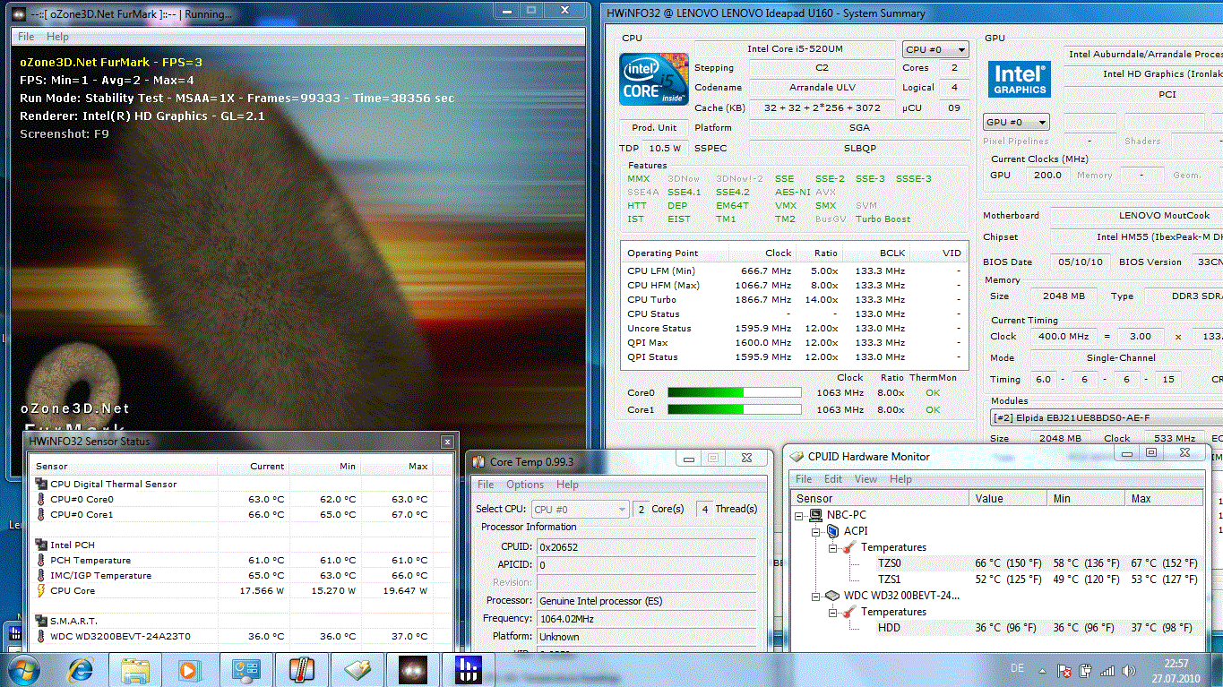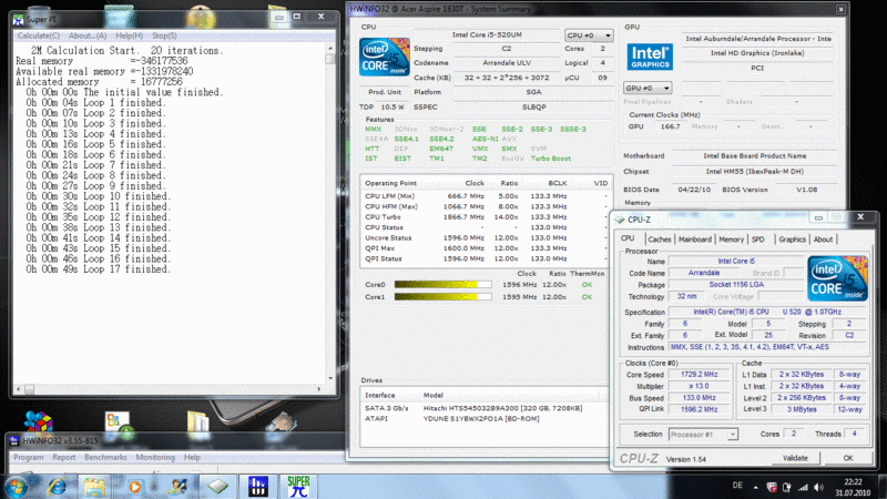 Turbo Boost für Einkern-Anwendungen und Hyper Threading (HT) für Mehrkern-Applikationen. Steckt die volle Notebook-Power im U160? Die Frage kann verneint werden, 1.86 GHz im Turbo-Boost genügen nicht, um eine Laptop-Leistung a la Core i3-330M (2 x 2.16 GHz, Turbo Boost) zu erhalten.