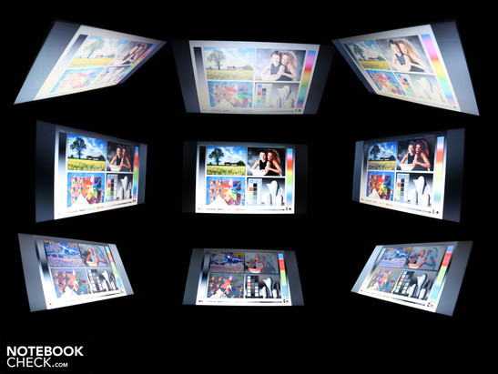 Die horizontalen Blickwinkel sind relativ tolerant. Bis etwa 45 Grad Abweichung von der optimalen Position erkennen wir Schrift und Farbe ordentlich. Jetzt beginnt die Farbinvertierung. Das Bild dunkelt aber schon ab 25 Grad leicht ab. Von unten oder oben, sieht es deutlich schlechter aus (Vertikal). Schrift ist zwar bis zirka 40 Grad gut ablesbar. Die Helligkeit geht aber bereits ab 10 Grad deutlich zurück. Versammeln sich mehrere Augenpaare vor dem IdeaPad, dann können die Betrachter von den oberen Positionen kaum etwas erkennen. Bereits bei 25 Grad Abweichung nach oben sind die Farben sehr stark invertiert.