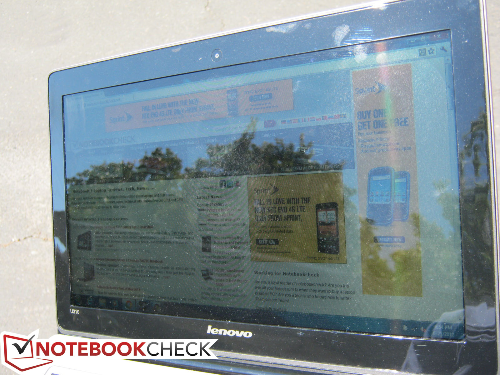 Für den Außeneinsatz eignet sich das Testgerät mittelmäßig. Eine Helligkeit von 200 cd/m² sind für Notebookcheck das Minimum, die für eine erträgliche Außenleistung notwendig ist. Leider gestaltet sich die Verwendung im Freien sowohl wegen der niedrigen Helligkeit als auch wegen der starken Reflexionen etwas mühsam. Das Arbeiten im Schatten hilft enorm, doch die starken Spiegelungen bleiben ein Ärgernis. Glücklicherweise wird im Akkubetrieb die maximale Helligkeit nicht verringert.