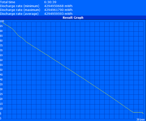 Lenovo wirbt mit einer Akkulaufzeit von bis zu 7 Stunden beim U310. Mittels BatteryEater Readers Test führten wir den üblichen Test auf die maximale Akkulaufzeit bei niedrigster Helligkeitseinstellung, abgeschaltetem WLAN und Energiesparprofil durch. Unter diesen optimalen Bedingungen wurde eine Akkulaufzeit von 6,5 Stunden, das ist deutlich weniger als die angegebenen 7 Stunden, erreicht. Es war uns also selbst als wir das Notebook unberührt ließen nicht möglich die gesamten 7 Stunden zu erreichen.