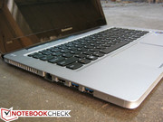 Die rechte Kante beim U310 wirkt dagegen ziemlich kahl. Ein powered-USB Port oder der Kensington Lock hätte sich auch dort gut gemacht. Aufgrund der höheren Kanten hätte man, ähnlich dem Toshiba Z830, sogar einen DisplayPort oder einen VGA-Ausgang in normaler Größe unterbringen können.