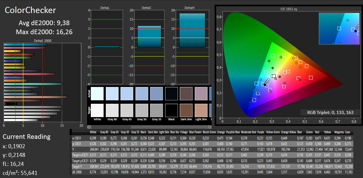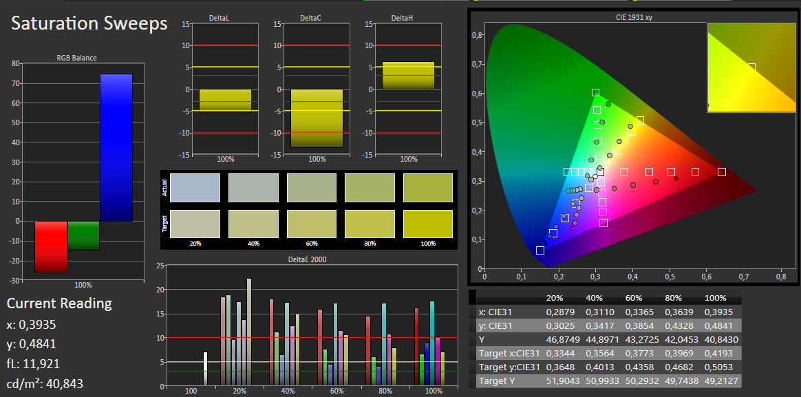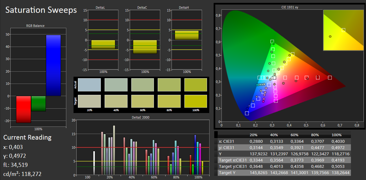 Das U330p ist bereits aufgrund der niedrigen Display-Helligkeit für Bildenthusiasten eindeutig nicht zu empfehlen. Auch bei der Farbraumabdeckung sieht es in Folge nicht viel besser aus. Die Farbkorrektheit wurde ebenso geprüft, mit nicht wirklich besserem Ergebnis: Sowohl Farben als auch Graustufen werden mit einem DeltaE2000 von teils deutlich über 15 stark vom Soll abweichend dargestellt. Ab Werk hatte das Testgerät zudem einen starken, sichtbaren Blaustich, der sich allerdings durch Kalibrierung verbessern ließ.