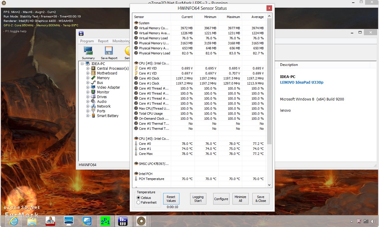 Kommen wir zum Belastungstest: Läuft Prime alleine, taktet die CPU zwischen 2,1 und 2,3 GHz. Wenn man allerdings Furmark dazuschaltet, reduziert die CPU den Takt auf 1,3 GHz, im weiteren Verlauf schwankt der Takt zwischen 1,1-1,3 GHz. Im Gegensatz dazu läuft die GPU im Bereich von 750-1000 MHz und taktet nicht herunter. Die auffallend niedrigen Ergebnisse in den Gaming-Tests lassen hier vermuten, dass das Kühlsystem unter kombinierter CPU-/GPU-Last überfordert ist, und dann nicht mehr die maximale theoretische Leistung der eingesetzten Hardware zur Verfügung steht.