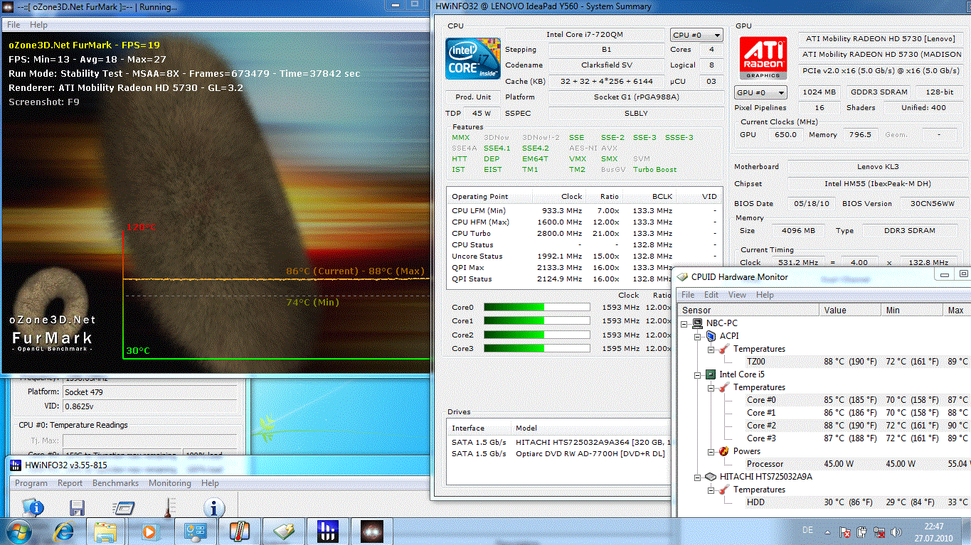 Immerhin hatte die hohe Temperatur im Stresstest von über 12 Stunden keinen negativen Einfluss auf die Stabilität des Y560. Es kam zu keinem Thermal Throttling: 7.258 3DMarks06, 3.116 CPU Score im direkten Anschluss an den Stresstest (1.280 x 1.024). Das sind identische Werte wie im normalen Test.