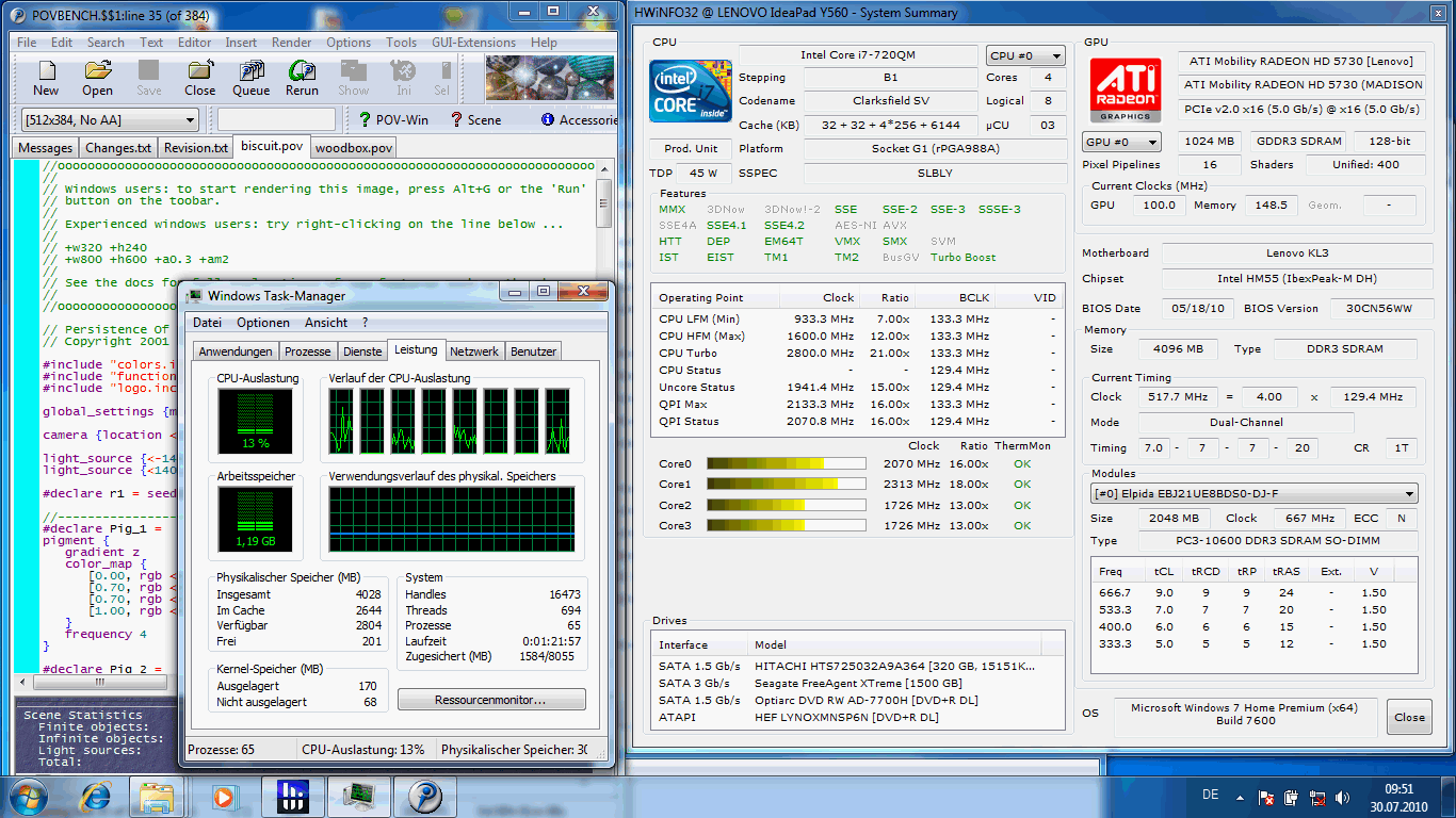 Zur Seite stehen dem Core i7-720QM ganze 4.096 MB DDR3 Arbeitsspeicher (PC3-10600). In unserem Testgerät sind zwei RAM-Module verbaut: Kingston neben Elpida. Der Performance schadet dies scheinbar nicht, obwohl es der Regel widerspricht, immer identische RAM-Riegel zu nutzen. Dem 64 Bit Betriebssystem Windows 7 Home Premium (nicht im Lieferumfang) steht die volle Speichermenge zur Verfügung, denn die ATI Grafikkarte benötigt kein Shared Memory.