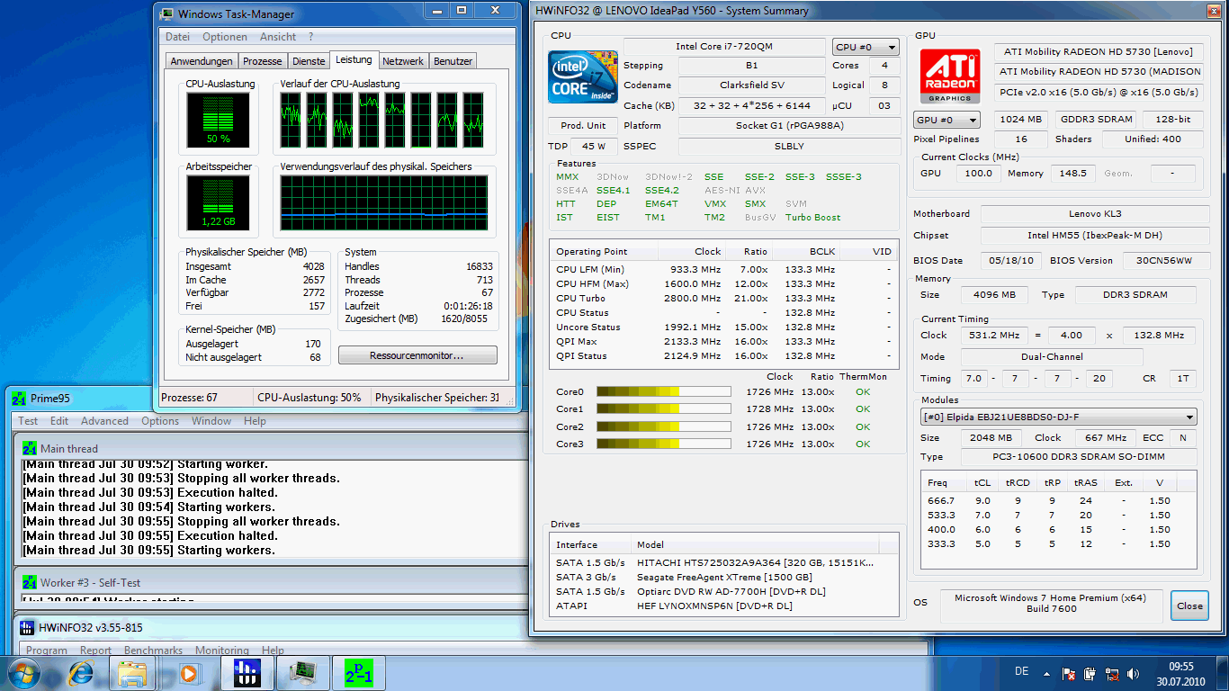 Der vorliegende 15.6-Zoller Lenovo Y560M29B9GE_4GB kostet 860 Euro (Version ohne Windows!) und bringt eine ATI Radeon HD 5730 nebst Intel Core i7-720QM mit. Das klingt äußerst interessant, denn die 7.282 3DMarks2006 starke GPU ist sonst in kaum einem anderen Notebook zu finden. Bereits im MSI GE600 bescheinigten wir der Kombination aus HD 5730 und i5-430M eine gute Gaming-Performance.
