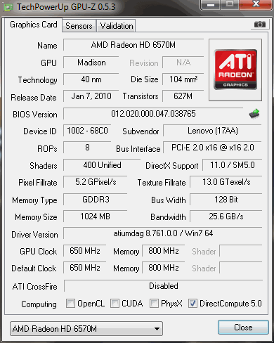 Bei der Grafikkarte handelt es sich um einen dedizierten Grafikchip. Hier fiel Lenovos Wahl auf AMD Modell Radeon HD 6570M. Die Grafikkarte unterstützt DirectX 11, Shader Model 5.0, OpenGL 4.1, OpenCL 1.1 und DirectCompute 11. Spiele, wie Fifa 11 sollten bei voller Qualität flüssig laufen. Bei anspruchsvolleren Spielen muss die Qualitätsstufe ein wenig gedrosselt werden, damit Spiele flüssig laufen.
