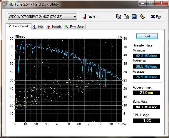 Lenovo stattet sein IdeaPad Y560p mit einer großen 750 Gbyte Festplatte aus dem Hause Western Digital aus. Doch die 2,5 Zoll Festplatte läuft nur mit 5400 Umdrehungen pro Minute und verliert somit an Geschwindigkeit ein. Dies zeigt sich auch in unserem Test mit HD-Tune. Die durchschnittliche Transferrate liegt bei 76,5 MB/s. Dieser Wert ist zwar nicht schlecht, und die Festplatte landet damit auch im Mittelfeld unserer Testdatenbank, aber würde die Peformance mit 7200 Umdrehungen (wie beim Vorgängermodell) pro Minute deutlich steigen.
