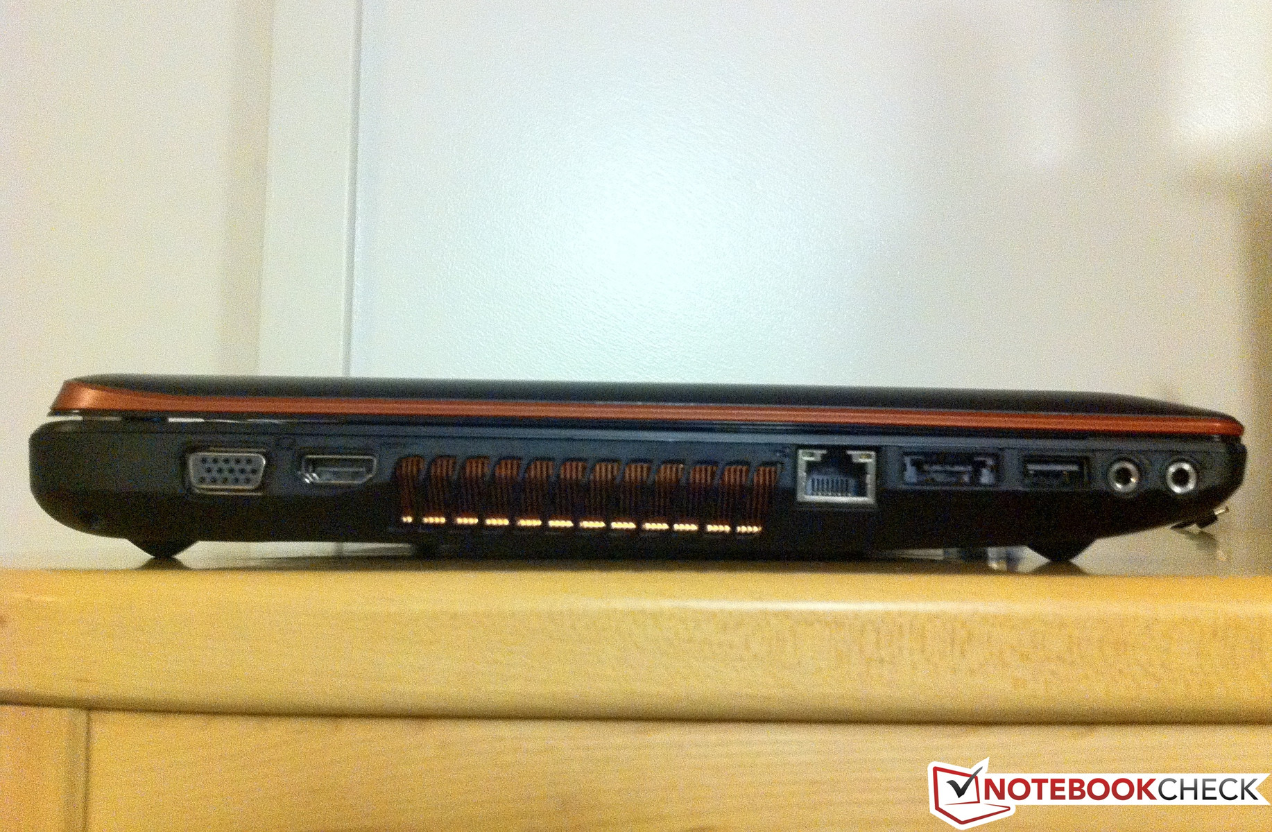 Die rechte Seite des Laptops wird zu einem großen Teil vom Slimtype DVD-/CD-Kombi-Laufwerk eingenommen. Nach vorne zu folgen zwei USB-3.0-Ports, nach hinten zu der Stromanschluss und der Kensington-Security-Lock-Slot. An der Vorderkante befinden sich ein SD-Kartenleser sowie zwei Schalter: der erste zum Umschalten zwischen eigenständiger und integrierter Grafik, der zweite zum Steuern der WiFi-Module. Links finden sich schließlich ein analoger VGA-Ausgang, ein HDMI-Anschluss, eine Ethernet-Schnittstelle, ein USB-/eSATA-Kombi-Port, gefolgt von einem USB-2.0-Port und Kopfhörer- und Mikrofonbuchse.