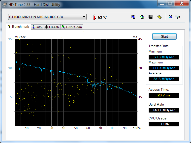 Wie beim ähnlich ausgestatteten Asus G55VW erweist sich der Massenspeicher als größte Schwachstelle des Y580, da Multimedia-Nutzer und Spieler üblicherweise der Kapazität gegenüber den Geschwindigkeitsvorteilen einer SSD den Vorzug geben. Das 1 TB Seagate Momentus Laufwerk in unserem Testmodell arbeitet mit einer dürftigen Geschwindigkeit von 5400 U/min, erreicht aber trotzdem laut HDTune eine respektable durchschnittliche Übertragungsrate von 84,3 MB/s. Dieser Vorteil wird jedoch durch die hohe Zugriffszeit von fast 21 ms relativiert. Typische Festplatten in teuren Notebookmodellen haben oft Zugriffzeiten, die sich näher bei 15 oder 16 ms bewegen. Daher sind Systemleistung und die Ladezeiten beim Y580 langsamer. Wir maßen im Auslieferungszustand eine Kaltbootzeit von ungefähr 1 Minute und 28 Sekunden - kein Rekord für mechanische Laufwerke.