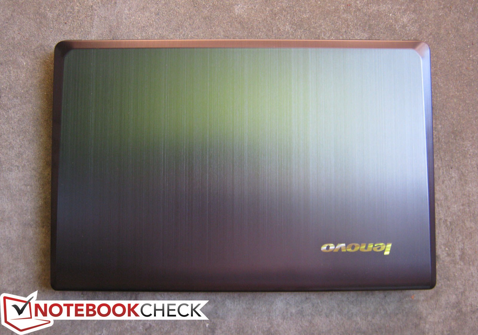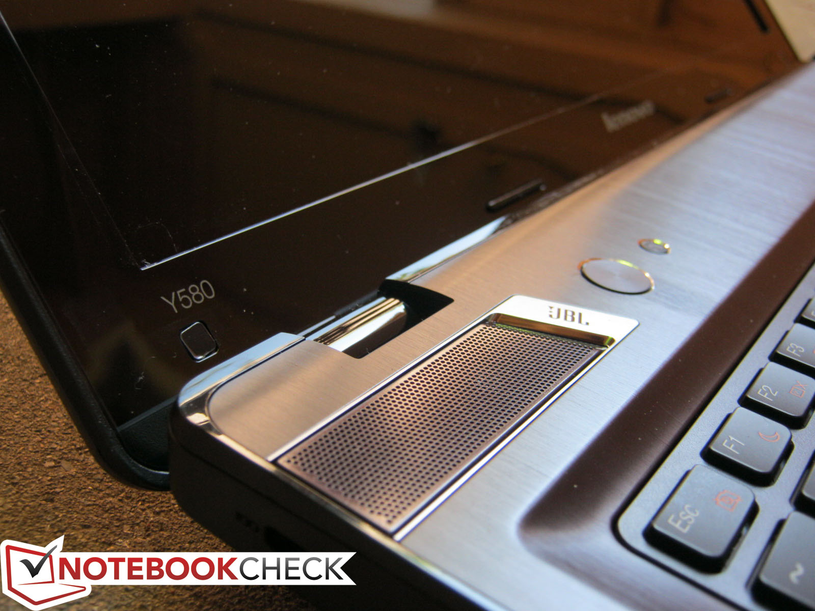 Das Aussehen hat sich nach Meinung des Testers im Vergleich zum Y570 des letzten Jahres deutlich verbessert. Während es mit 35,7 mm gleich hoch geblieben ist, weisen der schlankere dunkelgraue Bildschirmdeckel und die schwarzen Handballenablagen nun statt des langweiligen Kunststofflooks des Vorgängers die glänzende, seidige Optik gebürsteten Metalls auf. Das Gehäuse ist sowohl aus Aluminium als auch aus Polycarbonat-Kunststoff gefertigt, wobei das Metall zurückhaltender eingesetzt wurde. Der innere Rahmen ist beispielsweise vorwiegend aus glänzendem Kunststoff und damit deutlich weniger wertig als die edle, gebürstete Oberfläche an Bildschirmdeckel und der Basis. Mit anderen Worten wirkt das Y580 mit dieser Kunststoffverkleidung etwas billig. Ansonsten sieht das Notebook, angefangen mit den Chrome-Rahmen um Touchpad,Tasten und JBL Lautsprecher, ziemlich stylisch aus. Es ist aber damit zu rechnen, dass sich Fingerabdrücke und Staub leicht sammeln.