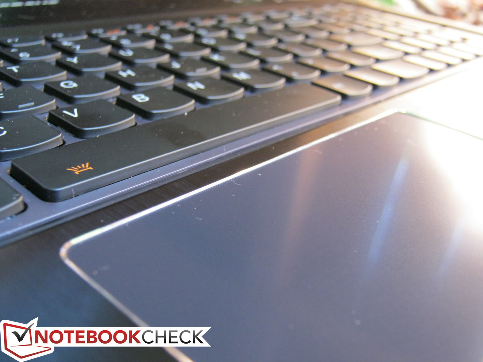 Abgesehen vom neuen eleganten Aussehen, funktioniert das Touchpad zudem entsprechend gut. Das Ansprechverhalten beim Bildlauf ist gut und die Multi-Touch-Steuerung funktioniert aufgrund der größeren Fläche besser als üblich. Klicken spricht ebenso gut an, könnte aber sogar, verglichen mit den meisten Ultrabooks, fester sein. Dies könnte mit der zuvor erwähnten billigen Anmutung des Touchpads zu tun haben, da die Oberfläche schlicht nicht besonders steif sondern ziemlich nachgiebig ist.