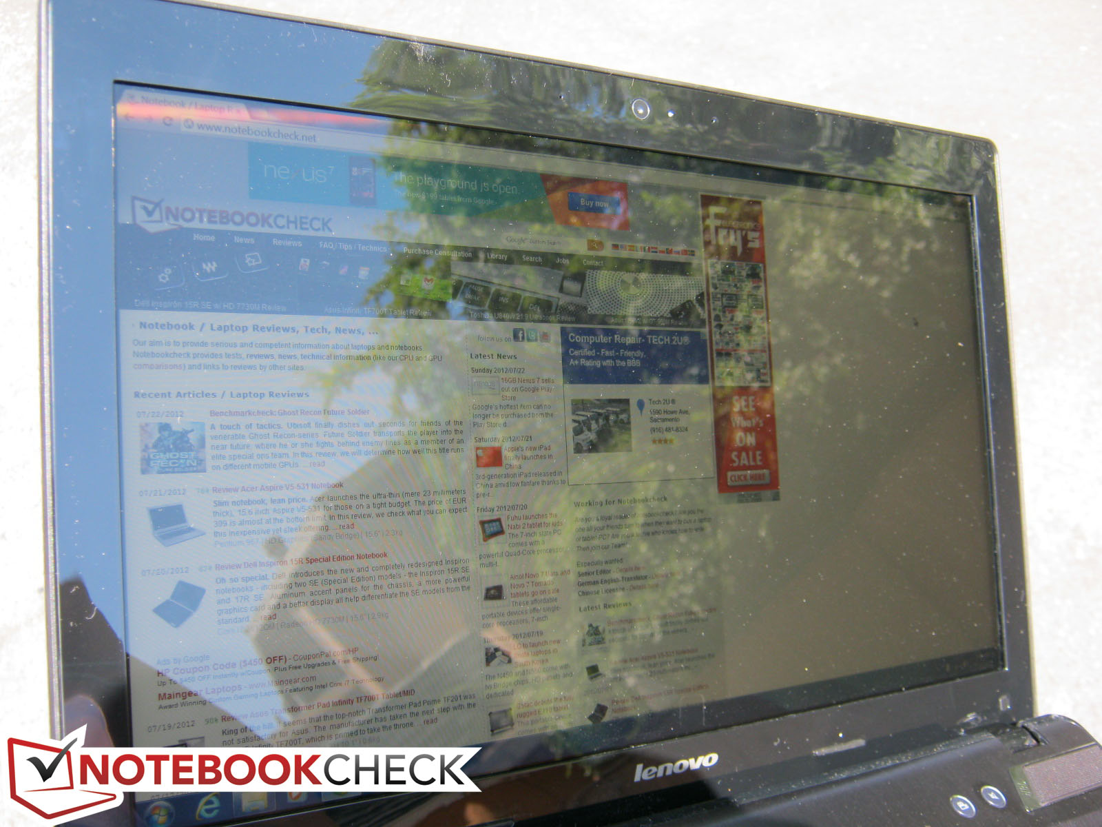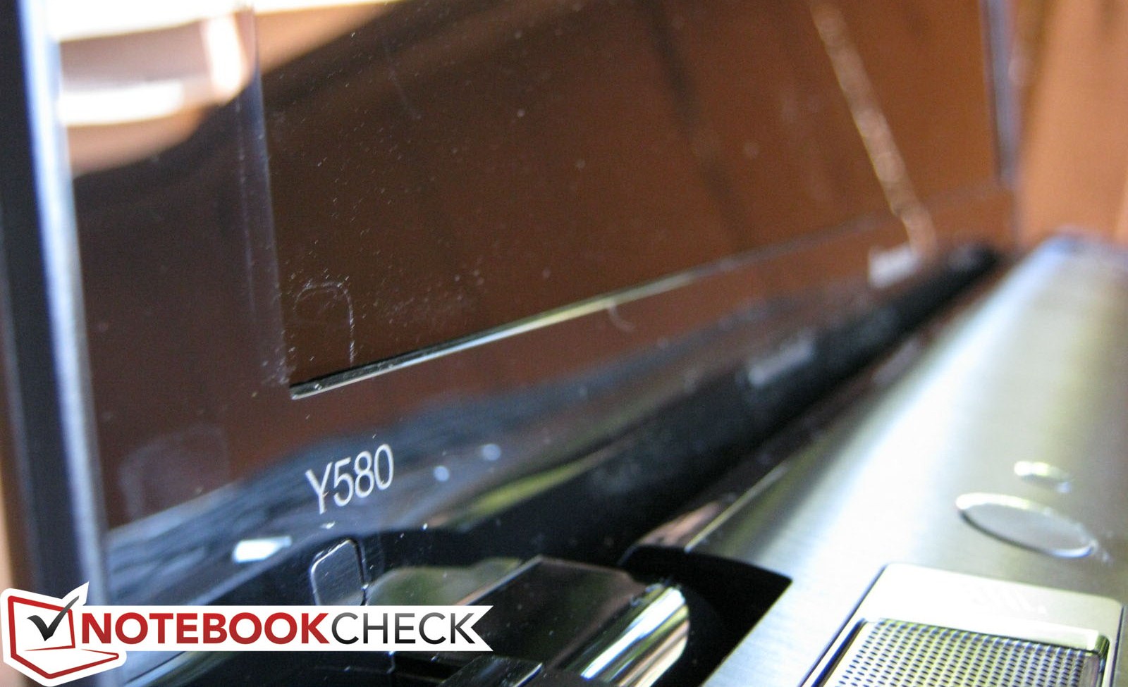Der größte Nachteil des Y580 ist, dass es besser aussieht und arbeitet, als es sich anfühlt. Die glänzende Lackierung und der nette metallische Schimmer fühlen sich wie Kunststoff mittelmäßiger Qualität an. Das Touchpad und der Bildschirmdeckel schneiden noch schlechter ab. Die Reflexionen am Bildschirm beim Spielen und bei der Video-Wiedergabe und die rasche Ansammlung von Fingerabdrücken mag viele Nutzer, die matte Bildschirme und langweiligere Gehäuse gewohnt sind, stören. Die Außeneinsatzfähigkeiten sind bestenfalls bei günstigen Bedingungen durchschnittlich (Glare-Display), was in Anbetracht der guten Akkulaufzeit schade ist.