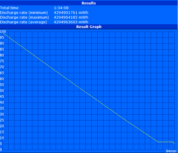 Um die minimale Akkulaufzeit aufzuzeichnen, wählten wir das Höchstleistungsprofil, maximale Helligkeit und aktivierten die eigenständige GPU. Mit dem BatteryEater Classic Test war der Akku in zirka 1 Stunde 30 Minuten leer.