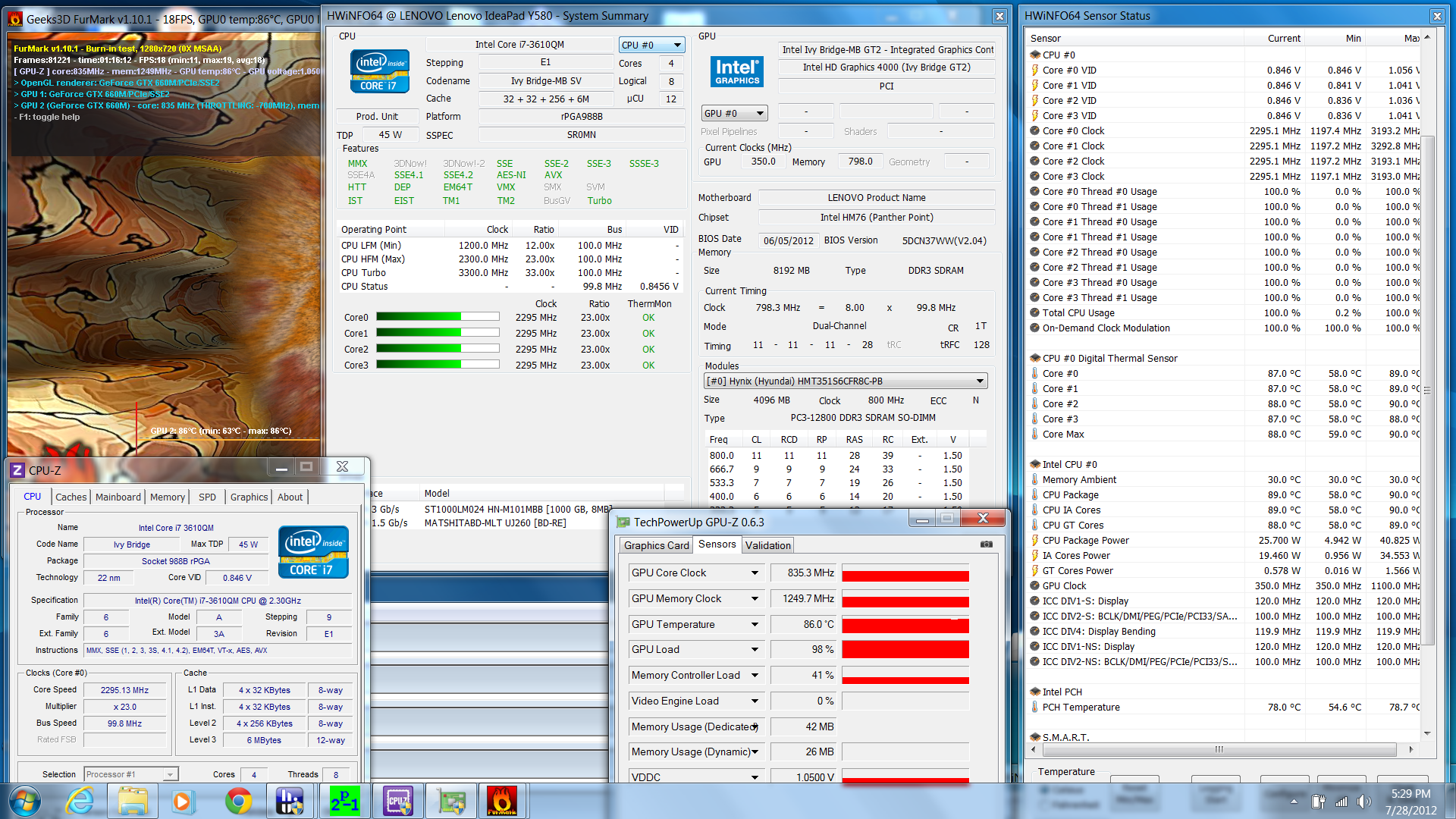 Volllast mit FurMark und Prime95 parallel brachte ähnliche Ergebnisse. Die Turbo Boost Vorteile verschwanden, doch weder CPU noch GPU Kerne fielen unter ihre Basistaktraten von 2,3 GHz und 835 MHz. Die Temperatur des Grafikkerns pendelte sich bei viel höheren 86 Grad Celsius ein, doch ein Leistungseinbruch wurde nicht beobachtet. Wir beobachteten daher beim Y580 keinerlei Throttling-Probleme.