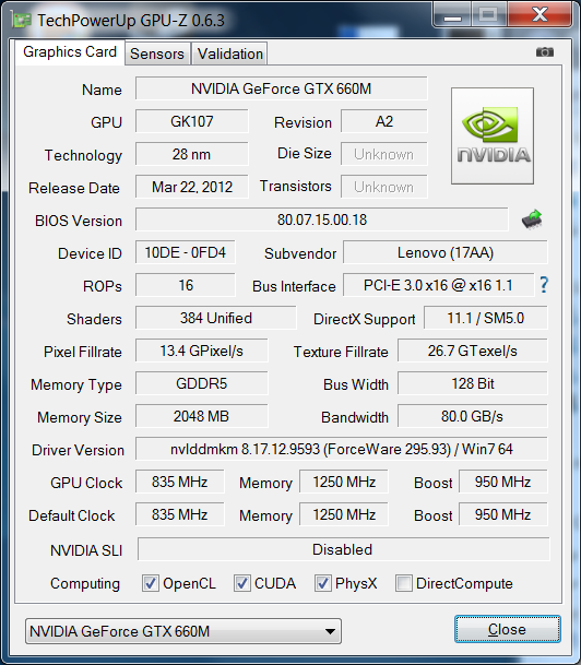 Die 28 nm GeForce GTX 660M (basiert auf dem GK107 Core) ist mit 2GB GDDR5 RAM ausgestattet und eine der stärkeren GPUs auf Kepler-Basis, da es sich bei der GTX 670M und der 675M einfach um neu benannte 40 nm Fermi-Karten handelt. Die 660M hat einen schnelleren Kern und höhere Speichertaktraten als die beiden letzteren, doch Nvidia hat die Leistung der 660M entsprechend skaliert, indem sie die Busbreite der 660M halbiert hat: 128-bit versus 256-bit bei der 675M.