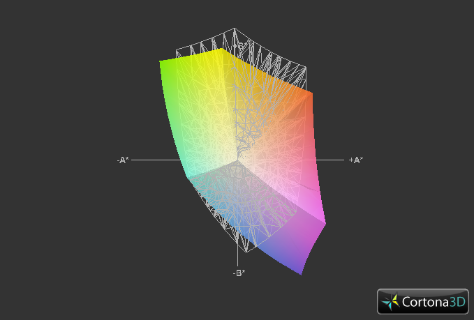 Die Farbdarstellung ist mit 91% des sRGB Spektrums deutlich überdurchschnittlich, da die meisten Bildschirme üblicherweise zwischen 60-80 Prozent schaffen. Der Standardnutzer mag den größeren Gamut nie bemerken, doch professionelle Grafiker würden dies sicherlich begrüßen.