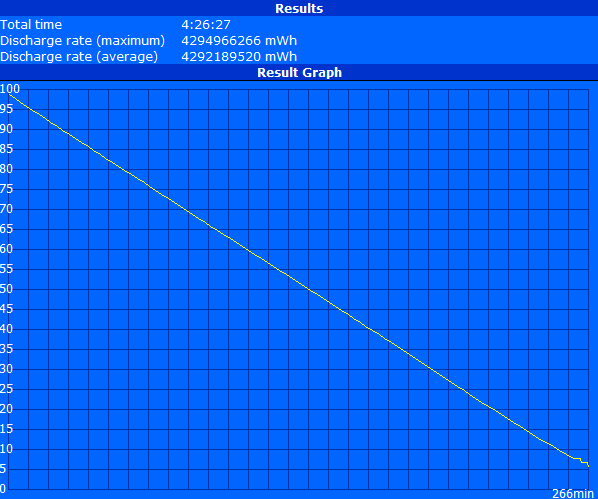 Bei 150 cd/m2 Helligkeit (Stufe 14/15) und Profil "Ausgewogen" zeichneten wir eine Akkulaufzeit von 4 Stunden 26 Minuten mit unserem sich wiederholenden Surf-Skript auf. Wir wissen zwar nicht, wie Lenovo "Produktiveinsatz" definiert, aber 4,5 Stunden kommen den Herstellerangaben von 5 Stunden ziemlich nahe. Der Benutzer kann daher von wenigstens 4 Stunden Textverabeitung und/oder Surfen ausgehen.