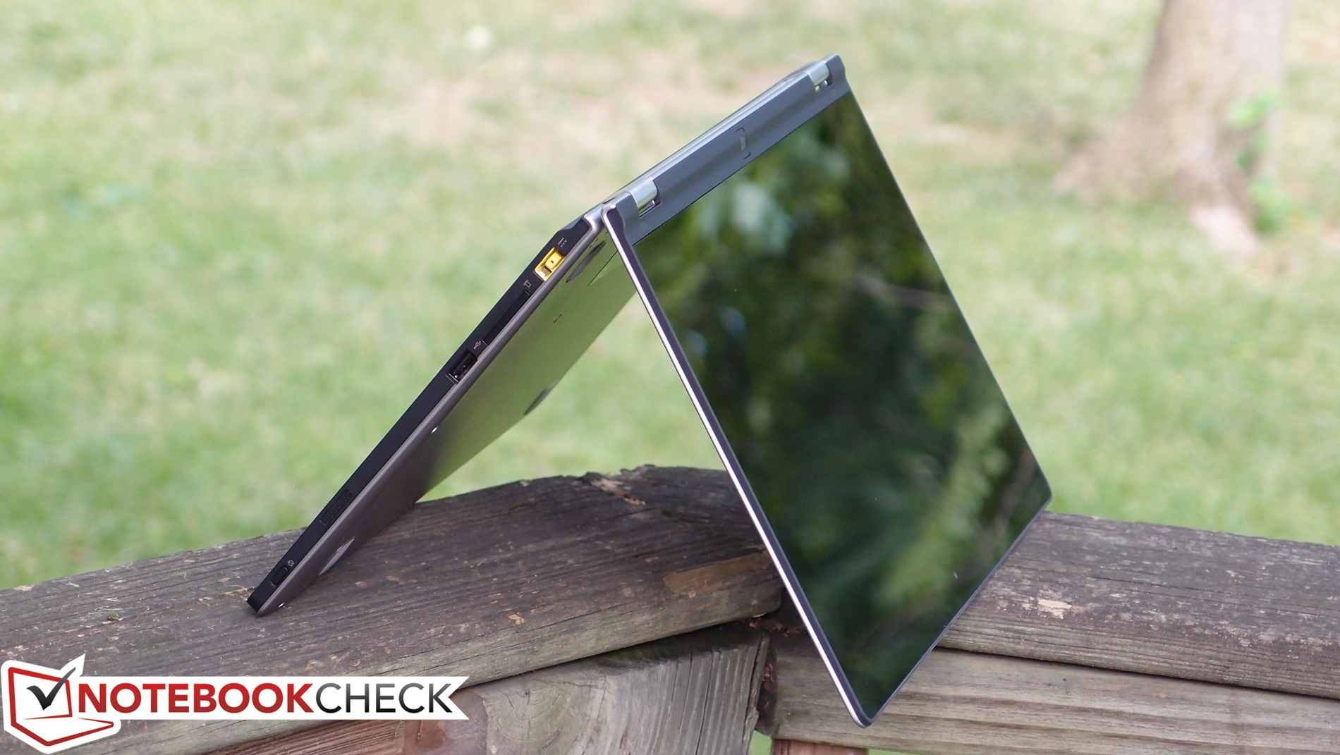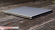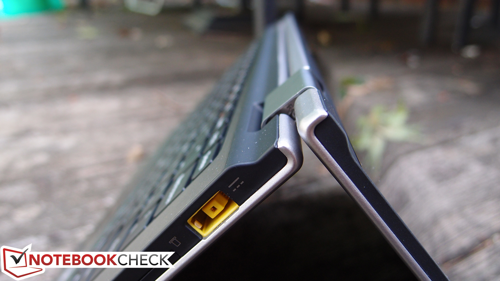 Wie üblich rühmt sich das Yoga mit seinen Verwandlungsfähigkeiten. Der Bildschirm kann um 360 Grad gedreht werden, sodass er unterhalb der Basiseinheit zu liegen kommt und sich das Gerät in ein Tablet verwandelt. Die große Beweglichkeit strapaziert sicherlich die Scharniere, die beim Yoga 11S zum Glück aus rostfreiem Stahl gefertigt sind, einen unverwüstlichen Eindruck machen und scheinbar besser mit diesen Kunststücken zurecht kommen. Andererseits ist es nicht besonders schwer, Basiseinheit und insbesondere Bildschirm des ausreichend robusten Gerätes zu verwinden. Im Praxiseinsatz erscheint dies jedoch unproblematisch.