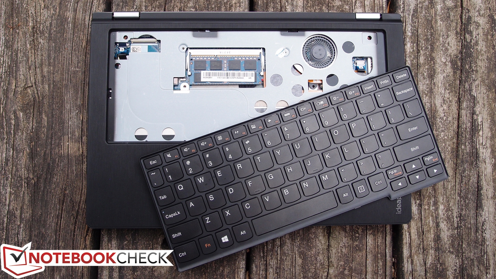 Das Yoga 11S ist nicht wartungsfreundlich: Um zu den inneren Komponenten zu gelangen, müssen zuerst die Tastatur und danach der umgebende Rahmen entfernt werden. Dazu muss der Nutzer die Gummifüße vorsichtig von der Unterseite des Gerätes entfernen. Dass das Äußere mit Hilfe von Torx Schrauben zusammengebaut ist, verkompliziert die Sache weiter.