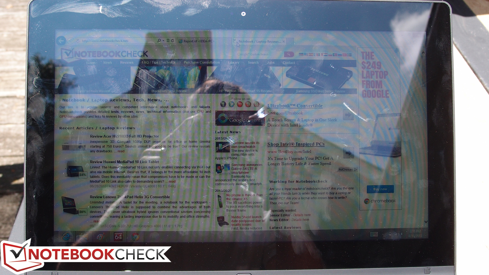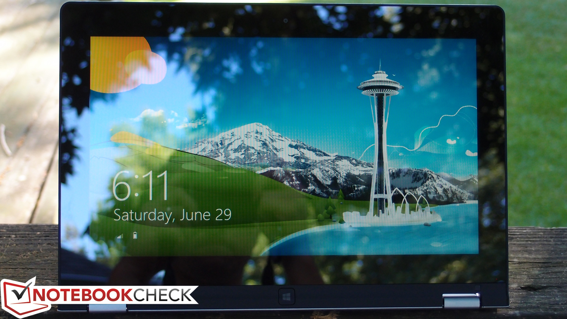 Trotz glänzendem Rand-zu-Rand-Plastik-Bildschirm ist das Yoga 11S im Außeneinsatz überraschend brauchbar, allerdings nur aufgrund der überdurchschnittlich hohen Helligkeit und des ausgezeichneten Kontrasts. Wenig überraschend sind Spiegelungen unter hellem Sonnenlicht ein Problem. Zudem werden Fingerabdrücke unter solchen Umständen besonders gut sichtbar. Wie beim Yoga 13 ist auch beim Yoga 11S der Helligkeitsunterschied zwischen Stufe 10 und 9 sehr groß.