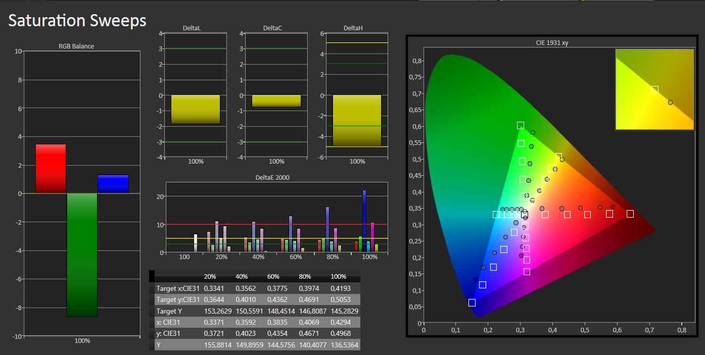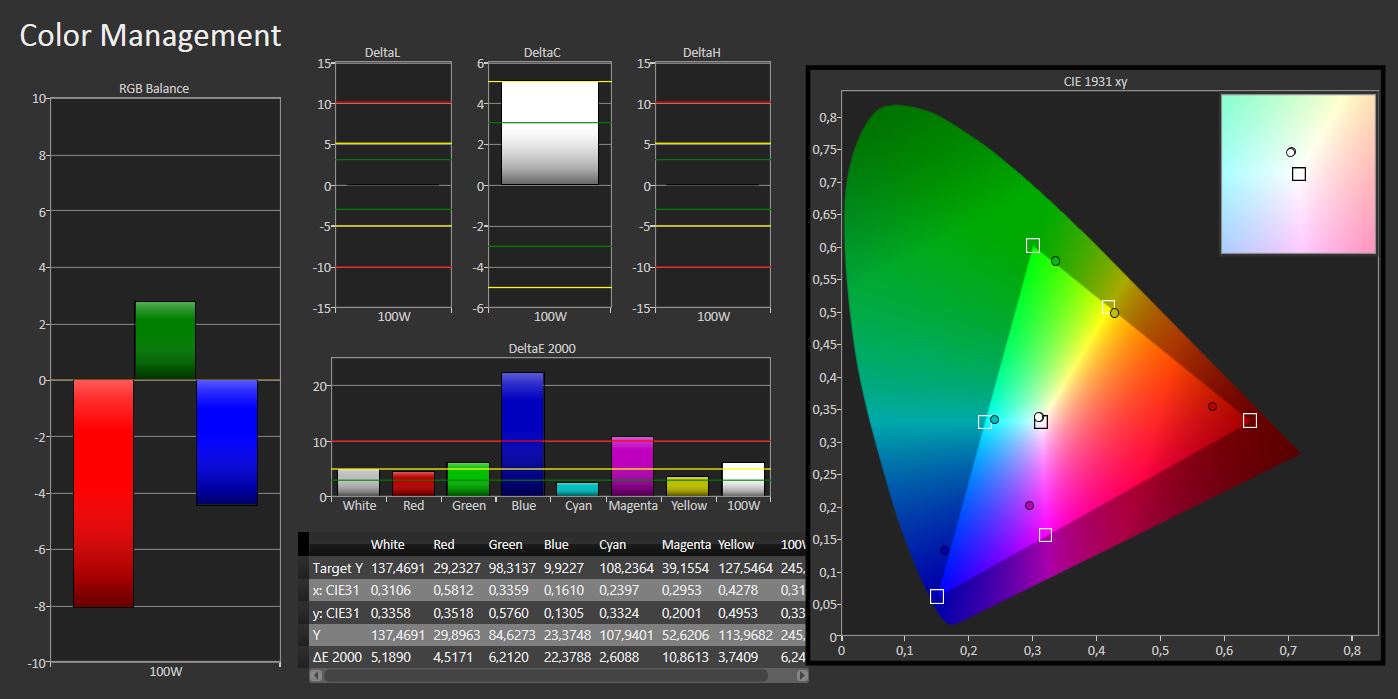 Obwohl sich der Weißpunkt ziemlich genau im Zielbereich der CIE 1931 Normfarbtafel befindet, liegen bis auf Cyan alle weiteren Farben absolut gesehen weit außerhalb der Zielvorgabe. Das ändert sich auch nach der Kalibrierung nicht. Auch die Sättigung entspricht nicht dem Soll und fällt insgesamt zu schwach aus. Weit außerhalb eines DeltaE von 5 bewegen sich hauptsächlich Blau und Magenta. Dieser Blaustich ist ein Nachteil vieler Displays, die mit White-LEDs ausgestattet sind. Im Vergleich zu einfachen Panels fällt dieser Effekt aber relativ gering aus. Sichtbar werden Abweichungen für das menschliche Auge ab einem DeltaE von 3 und mehr.