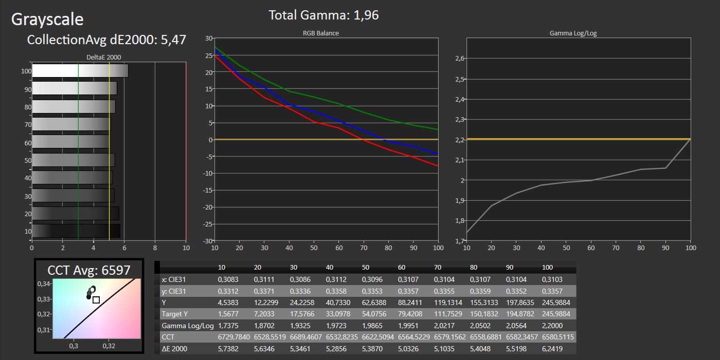 Wir haben die Farbverbindlichkeit des Panels mit dem Programm CalMAN und einem Fotospektrometer x-rite i1 Pro 2 überprüft. Je nach Helligkeitseinstellung liegt der Gamma-Wert zwischen 1,7 bei 10 Prozent Helligkeit und der Zielvorgabe 2,2 bei maximaler Helligkeit. Ebenfalls helligkeitsabhängig schwankt die Farbtemperatur zwischen 6.025 Kelvin und 6.368 Kelvin und bleibt damit unter dem Ideal von 6.500 Kelvin.