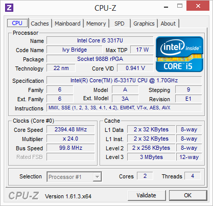 Unser Testmodell ist mit einer Mittelklasse 1,7 GHz Core i5-3317U CPU der dritten Generation ausgestattet. Im Profil "Ausgewogen" und "Energiesparen" nutzen beide Kerne einen Idle-Takt von 800 MHz. Zudem werden noch zwei weitere ULV-Ivy-Bridge-CPUs angeboten, die i3-3217U und die i7-3517U, doch keine optionalen Standard-Volt- oder Sandy-Bridge-Prozessoren. Der verwendete i5-Prozessor ist heute in Ultrabooks und ultraschlanken Notebooks, einschließlich Toshibas Satellite Z930, Samsungs Series-9-Modellen, Acers Aspire Modellen und dem MacBook Air 11, üblich. Die TDP der 17-W-CPU ist nur etwa halb so hoch wie bei den Standard-Volt-Gegenstücken und die Leistung sollte für übliches Internet-Surfen und Videowiedergabe mehr als ausreichen. Weitere Informationen und Benchmarks des i5-3317U können unserer CPU-Seite entnommen werden.