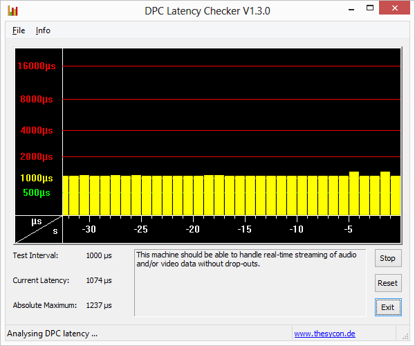 Der DPC Latency Checker zeigt selbst bei eingeschalteten Funkmodulen keine wiederkehrenden hohen Latenzspitzen.