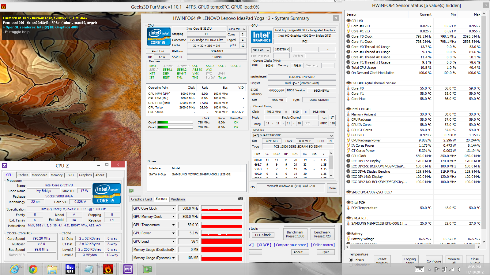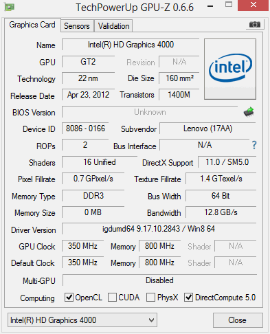 Die Ergebnisse in den synthetischen GPU-orientierten Benchmarks erscheinen nicht gerade berauschend. Die integrierte HD 4000 GPU kann mit Hilfe von Turbo Boost auf bis zu 1050 MHz hochtakten, doch kann sie dies während unserer 3D-Spielesessions offenbar nicht ausschöpfen. ULV-Prozessoren wie das i5-3317U ziehen hier den Kürzeren, da Standard-Volt-Ivy-Bridge-CPUs die gleiche HD 4000 GPU mit höheren Turbo-Boost-Taktraten von bis zu 650 MHz oder 1100 MHz betreiben können.