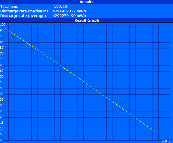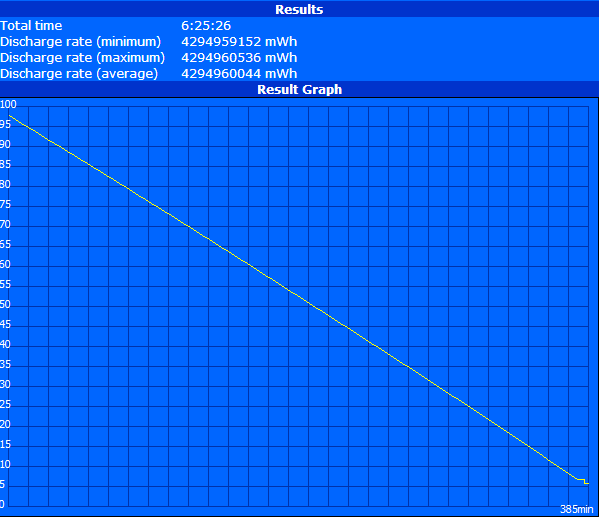 Wir führen die üblichen Akkutests durch und zeichnen die Laufzeiten mit Hilfe des Battery Eater Tools auf. Für den Test auf maximale Akkulaufzeit dimmen wir den Bildschirm auf die niedrigste Helligkeit, wählen das Energiesparprofil und deaktivieren alle Funkmodule. Der Akku hält in diesem Szenario fast 6 Stunden und 30 Minuten durch.