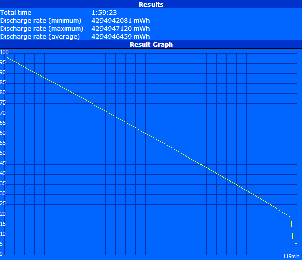 Die minimale Laufzeit wird bei maximaler Helligkeit, eingeschalteten Funkmodulen und mit Höchstleistunsprofil ermittelt. Mit dem Battery Eater Classic Test schaltet sich das Notebook nach zirka 2 Stunden automatisch aus.
