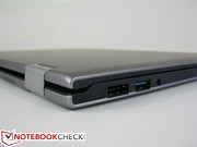 Für ein Ultrabook ist die Schnittstellenausstattung durchschnittlich. Man sollte sich also nicht zu viel erwarten. Da die Rückseite vollständig für Scharniere und Lüftung reserviert sind, befinden sich alle Ports, auch um störende Kabel links und rechts vom Notebook zu vermeiden, im hinteren Bereich der linken und rechten Seitenkante.