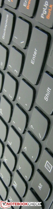 Die Backspace-, die Eingabetaste und die Umschalttasten rücken etwas in den Hintergrund, da sie kürzer als in anderen Notebooks sind. Hier hat der Nutzer also weniger Spielraum, was zu Fehltreffern führen kann, doch bei normaler Verwendung hatten wir keine Probleme mit der Genauigkeit. Allerdings wäre es möglich, dass einige Benutzer ein bis zwei Tage Eingewöhnungszeit brauchen, um sich an die kleineren Ausdehnungen dieser oft benutzten Tasten zu gewöhnen.