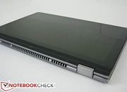 Die Scharniere des Notebooks sind entscheidend für die Verwandlungsfähigkeit des Yoga, die von der Festigkeit und Dauerhaftigkeit der Drehpunkte abhängt. Erleichtert können wir feststellen, dass die Scharniere stark genug sind, um unbeabsichtigte Bewegungen des Bildschirms zu verhindern, die oft beobachtet werden können, wenn ein Notebook mit weit geöffnetem Deckel transportiert wird. Die Kraft, die zum Bewegen der Scharniere benötigt wird, ist konstant und hängt nicht vom Öffnungswinkel ab. Doch der Bildschirm kann in unruhigen Umgebungen, wie Auto oder Bus, leicht vibrieren. Im Tablet-Modus wird der Bildschirm glücklicherweise von Magneten fixiert, sodass hier Bewegungen verhindert werden. Zwar handelt es sich nicht um die starrsten Scharniere die wir hier antreffen, doch sie leisten im Testzeitraum gute Arbeit.