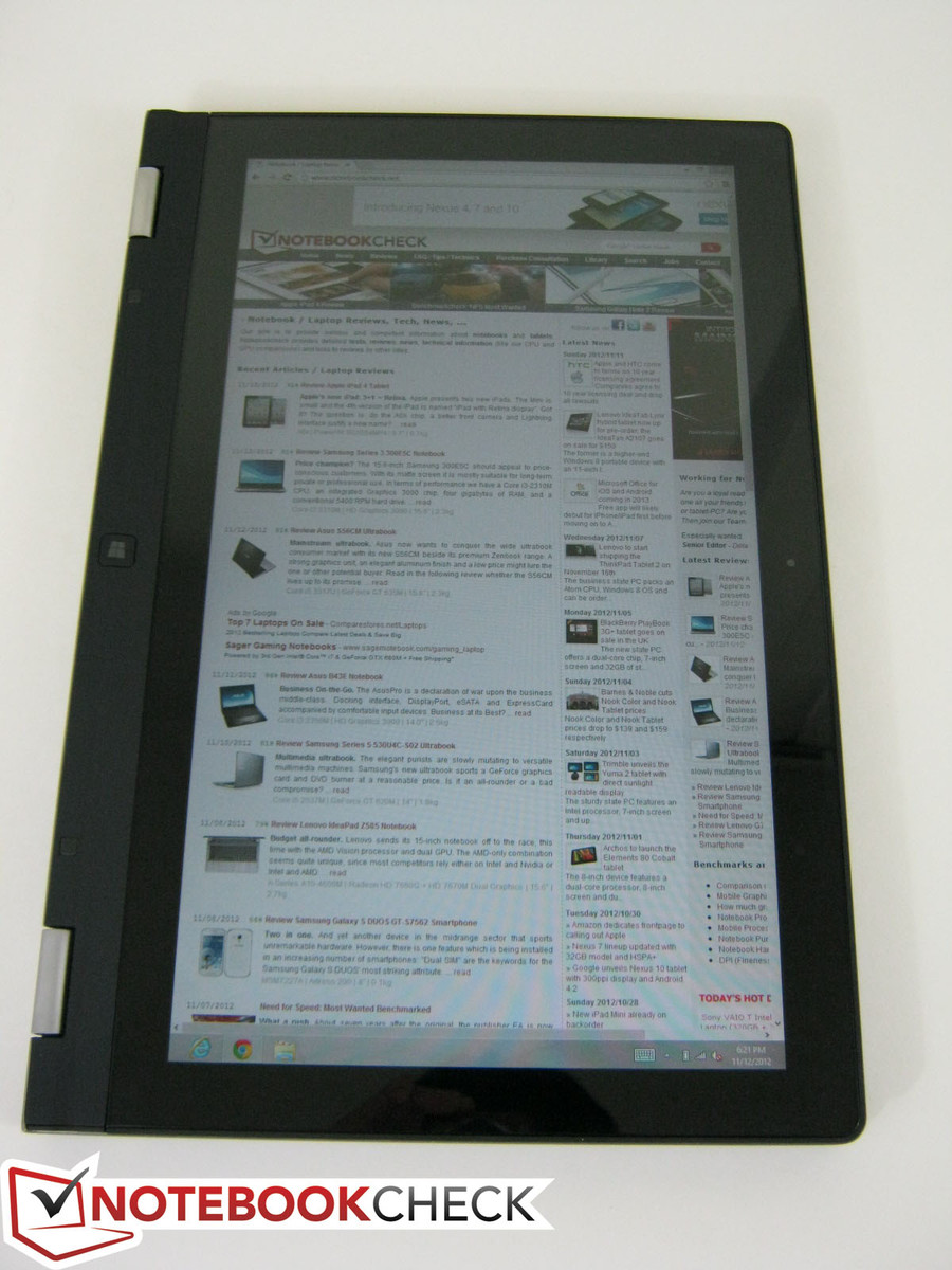 Die Blickwinkelstabilität ist, wie von einem IPS-Panel zu erwarten, ausgezeichnet. Farbinversionen können nicht und ein Helligkeitsverlust nur in geringem Ausmaß bei flachen Winkeln beobachtet werden. Gemeinsames Betrachten des Bildschirminhaltes ist unabhängig von der aktuellen Ausrichtung der Anzeige für mehrere Personen leicht machbar. Kurzum: Der Bildschirm des Yoga 13 beeindruckt optisch und die Darstellung wirkt zweifelsohne lebendiger und schärfer als von TN-basierten Ultrabooks.