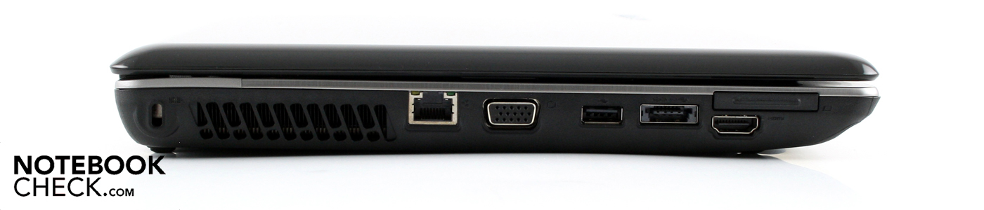 Externe Monitore oder TFTs können an HDMI oder an die analoge VGA-Schnittstelle angeschlossen werden. USB-Steckplätze gibt es nur drei Stück, wobei der kombinierte eSATA bereits mitgezählt ist. Die vordere Position der Ports ist nicht besonders sinnvoll. Bei Einsatz einer Maus werden Linkshänder benachteiligt. USB-Kabel, aber vor allem HDMI / VGA, werden den Einsatz der Maus behindern. Eine Anbringung an der Rückseite oder zumindest an den hinteren Positionen wäre für eine nicht störende Verkabelung auf dem Schreibtisch sinnvoller.