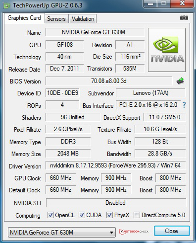 Im bewährten 3DMark 06 erzielt die GPU ein Ergebnis von 7948 Punkten und liegt damit im erwarteten Rahmen. Auf diesem Niveau finden sich beispielsweise das Lenovo ThinkPad Edge E530 mit gleicher GPU oder Geräte mit der älteren Nvidia GeForce GT 540M, wobei die Basis beider Grafikeinheiten die Fermi Architektur bildet. Im Gegensatz dazu basiert die Nvidia GeForce GT 640M - als Alternative für das IdeaPad Z58 - schon auf der neueren Kepler Architektur, die in 28-Nanometer-Strukturbereite gefertigt wird. Im 3DMark 06 erreicht diese Grafikeinheit 12545 Punkte (MSI CX70) und sichert sich einen deutliches Plus von 58 Prozent. In Kombination mit dem zuvor erwähnten Quad-Core-Prozessor müsste man bei diesem Notebook aber einen Aufpreis von 180 Euro im Vergleich zur Testkonfiguration auf die virtuelle Ladentheke legen.